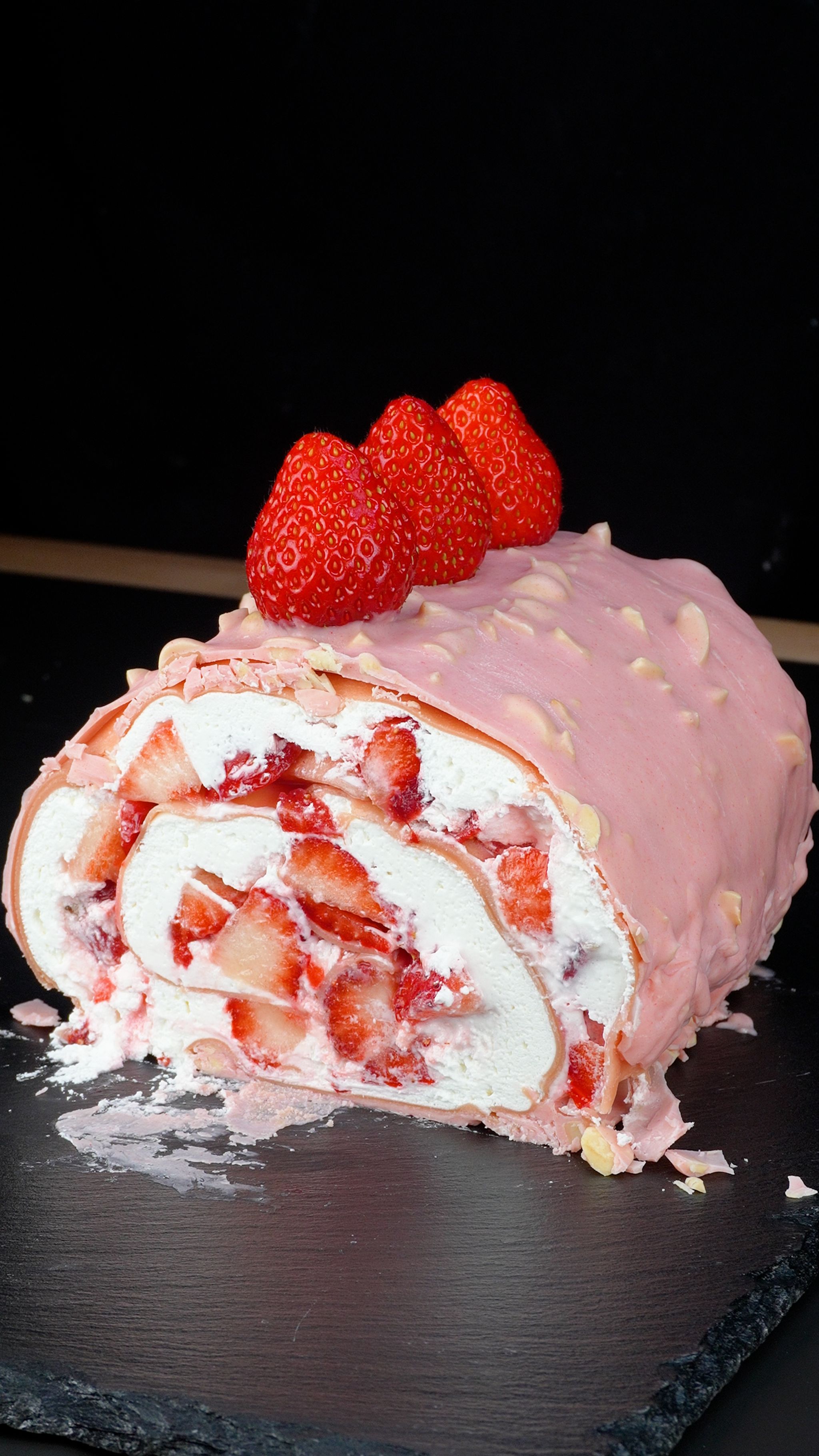 Encasing this is rich Japanese strawberry chocolate and finely crushed pistachios.