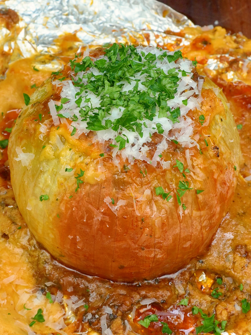 Bathed in rich waves of butter and wrapped in a foil veil, it slowly bakes until the onion crumbles tenderly.